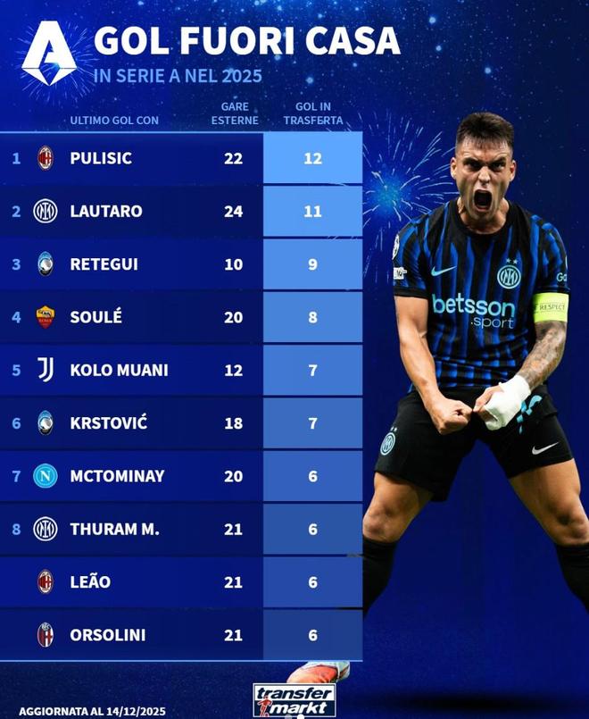 意甲球员2025年客场进球榜:普利希奇12球第1,劳塔罗11球第2